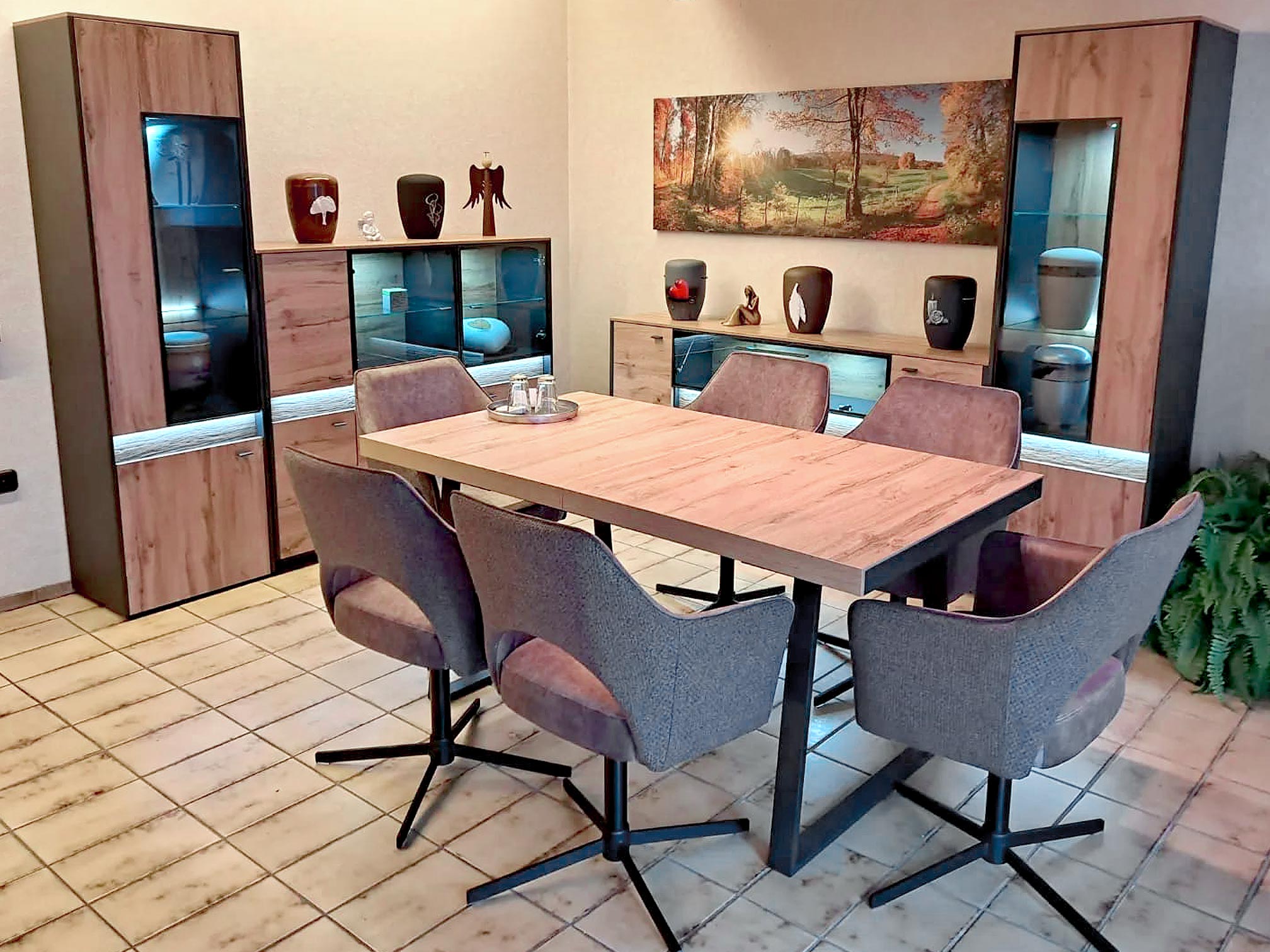 Besprechungsraum und in der Ausstellung findet das Beratungsgespräch in neutraler Umgebung statt. Särge, Einbettungen und Urnen